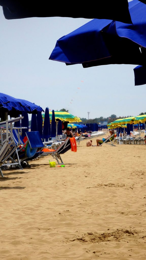 Ein Hauptaspekt für uns war, dass das Hotel einen Privatstrand hat. Dieser befindet sich zwar nicht unmittelbar am Hotel, da dieses im mittleren der drei Orte Lignano liegt, aber 10 Minuten mit Kinderwagen und gesunden Füßen und man ist dort. Sicher, es hätte auch Hotels unmittelbar am Strand gegeben, aber dort hätten wir dann täglich zwischen 6 und 18 Euro für Liegen und Schirm bezahlen dürfen, so war das alles im Hotelpreis inklusive.
